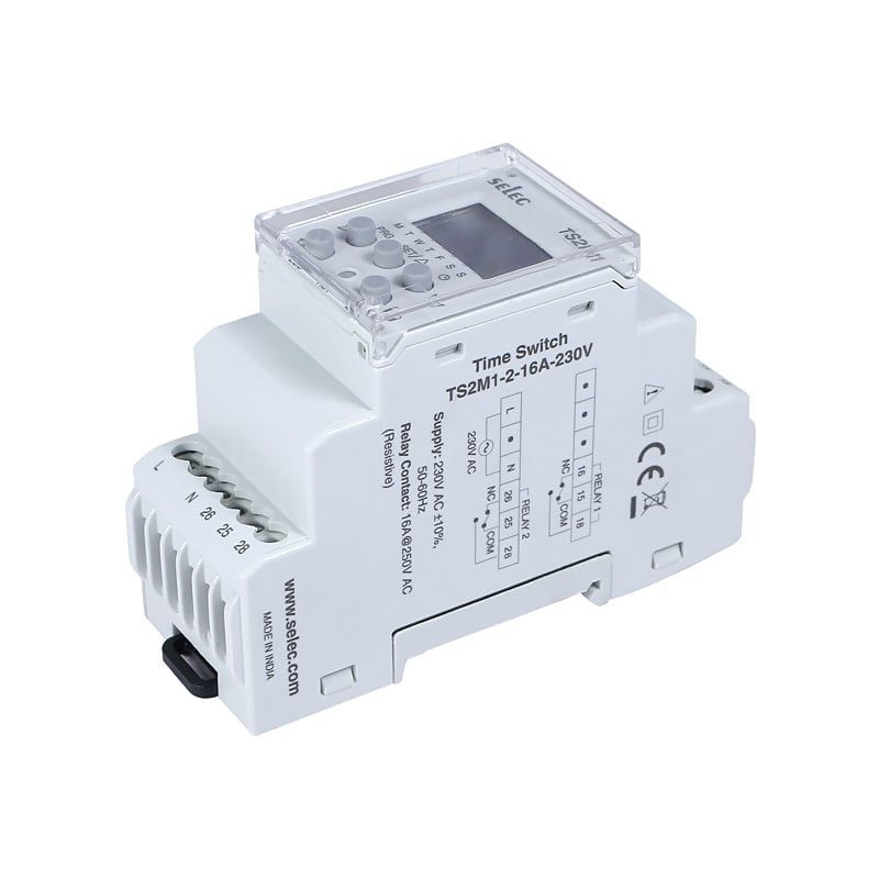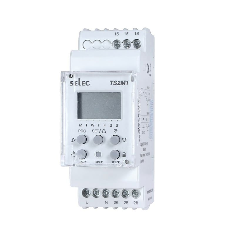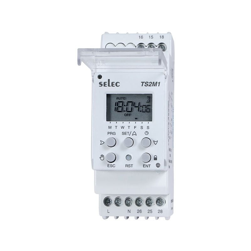 Công tắc hẹn giờ Selec TS2M1-2 có màn hình hiển thị dạng Text LCD, giúp hiển thị thông tin cài đặt rõ ràng, nét và dễ nhìn. Cài đặt các chương trình dễ dàng với 4 nút điều khiển nổi và 1 nút Reset chìm.