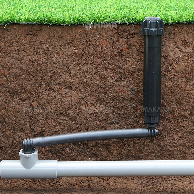 Mặt cắt lắp đặt đầu tưới cỏ PS Ultra PSU-04 với phụ kiện Co nối ren 21mm ra ống PE 16mm