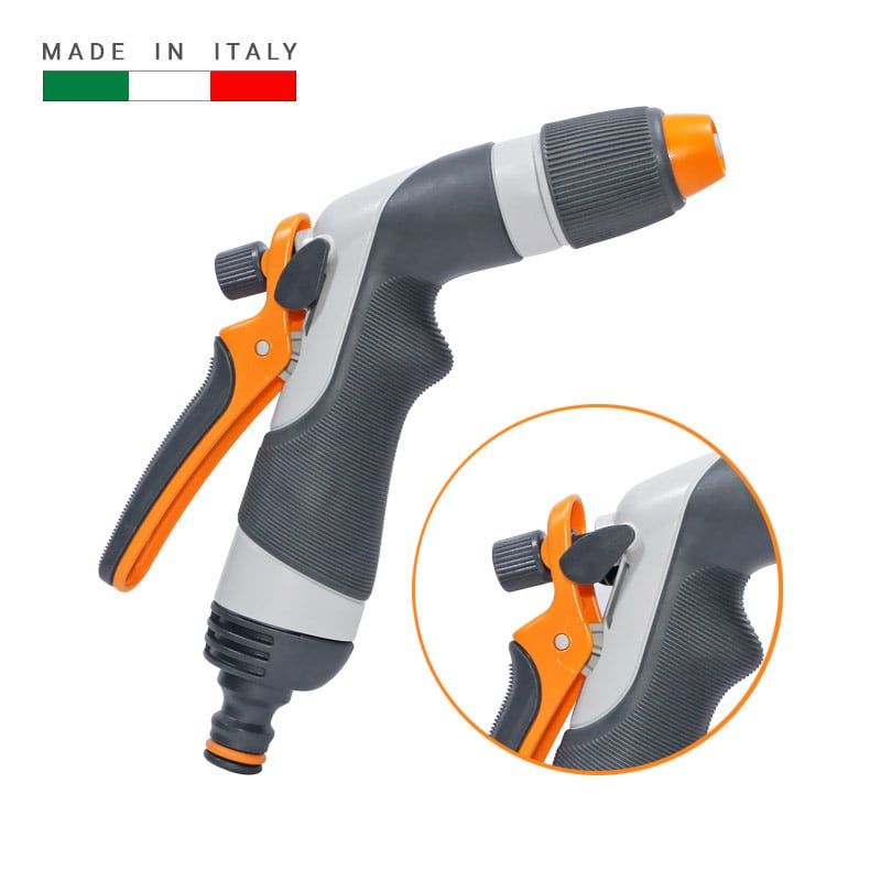 Trang bị chốt gạt cố định cần bóp, giúp vòi tưới hoạt động liên tục mà không cần giữ tay, rất tiện lợi khi tưới lâu hoặc vệ sinh diện tích lớn.